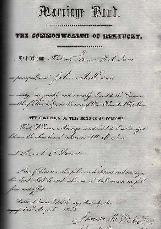 | Dickens, James M. & Sarah J. Powell (Marriage Bond) | Grace Prater |