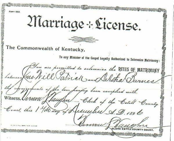 | Patrick, John William & Anna Delitha Barnes (Minister's Cert.) | Connie Patrick Waldrop |