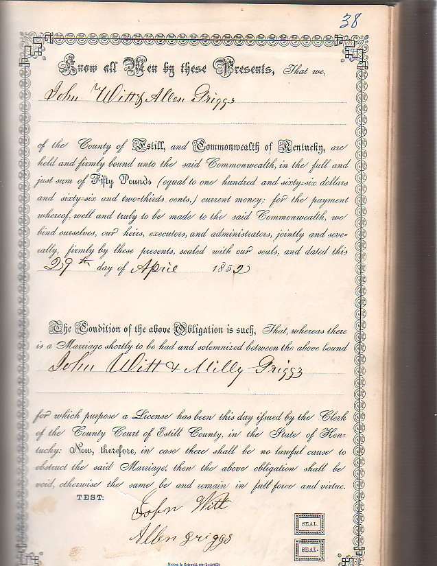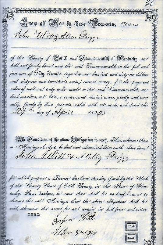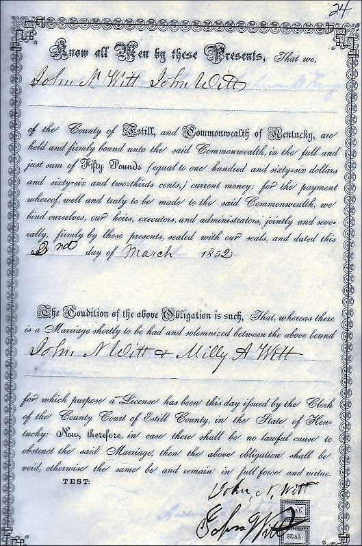 | Witt, John N. & Milly A. Witt (Marriage Bond) | Grace Prater |
