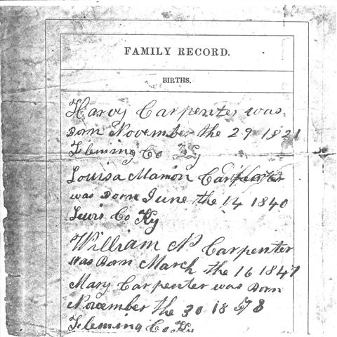 1. Harvey Carpenter, born Nov 29,1821, Fleming Co., KY