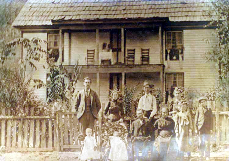 the jct of Rt 122, at Salisbury/Printer Area of Floyd Co, Ky, Picture taken abt1938 Standing: Millard McGlothen & wife, Moses Ann "Kate" SwartzMcGlothen, holding grandson, Morton Parker McGlothen 2nd row: James "Jim " McGlothen & Mildred McGlothen, children of Millard & Kate 1st row: CharlesMcGlothen (holding dog) ,s/o Millard & Kate and Aileen Hagans, d/o Claude Hagans Submitted by Carol Howell McGlothen |