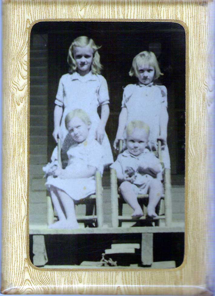 | Tin pic of Geneva Hamilton (Flora) (top left), Mildred Irene Hamilton (Weaver) (top right) my mother, Nana Belle Hamilton (Eller) (bottom left) and Clarence Hamilton (bottom right). They are children of Steve (son of Nelve Hamilton) and Roseanne Hamilton (daughter of Lee Hamilton and Betty Akers) |