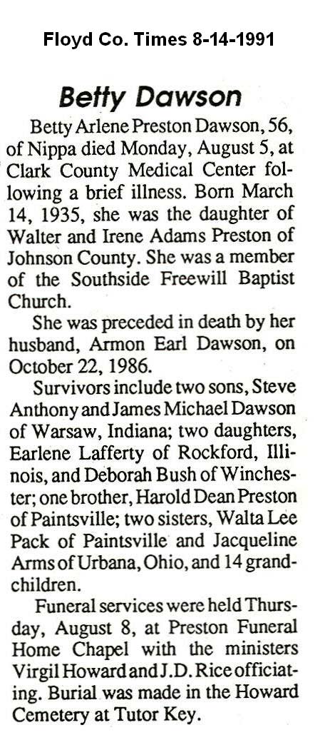Age 74, of Wayland, died Thursday, May 4, 2006, at the Riverview Health Care in Prestonsburg. Born December 1, 1930, in Harlan, she was the daughter of the late William and Edna Herrin Stanford. She was a homemaker and a member of Praise Assembly Church of God at Water Gap, in Prestonsburg. She is survived by her husband, Harold W. Dixon. Survivors, in addition to her husband, include three sons: Harold Gene Dixon, wife Sherrie, of Garrett, Terry Lynn Dixon of Prestonsburg, and Gregory Keith Dixon, wife Kathy, of Prestonsburg; one daughter, Janet Louise Bingham, husband Jeff, of Auxier; one brother: Jackie Paul Stanford of Liberty; 10 grandchildren and eight great-grandchildren. In addition to her parents, she was preceded in death by one son, Michael Ray Dixon; eight brothers: Ernest (Duke) Stanford, Floyd Stanford, William Stanford, Robert Stanford, Danny Stanford, Gail Stanford, Howard Stanford, and Eugene Stanford; two sisters Edna Hunter and Pauline Collins Funeral services were conducted Monday, May 8, at 1 p.m., at Praise Assembly Church of God at Water Gap in Prestonsburg, with J.M. Sloce officiating. Burial was in Miners Cemetery, in Eastern, under the direction of Nelson-Frazier Funeral Home, in Martin. Visitation was at the funeral home. (FCT'S)