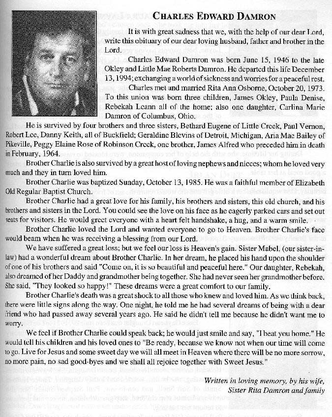 . , Age, 63, of Tram, died Friday, January 22, 1999, at Highlands Regional Medical Center following an extended illness. Bom on December 25, 1935, in Floyd County, he was the son of the late Erman and Liza Click Damron.He was a retired factory worker. Survivors include his wife, Maggie Jarvis Damron; three sons, Bobby D. Damron and Kenneth Ray Sturgill, both of Tram, John K. Sturgill of Prestonsburg; three daughters, Marsha Damron of Lexington, Vonda Sue Young of Churubusco, Indiana, Wanda Jean Johnson of Somerset; three brothers, David Damron, James Damron, and Bums Damron ,all of Prestonsburg; three sisters, Janet Sue Damron of David, Faye Jervis of Prestonsburg, Myrtle Workman of Proctorville, Ohio Burial was in the Stratton Cemetery at Ivel