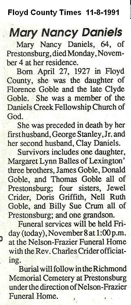 Age 68, of Martin, died Tuesday, September 5, 2006, at the McDowell Appalachian Regional Healthcare. Born February 25, 1938, in Floyd County, she was the daughter of the late Chester and Maxie Cooley Allen. She was a librarian for the Floyd County Library Board, and a member of the United Methodist Church at Wheelwright. Survivors include a son and daughter-in-law: Donnie and Sandy Daniels of Melvin; a sister and brother-in-law, Eloise A. and Homer Lee Hall of Hueysville; and three grandchildren: BreAnna, Allison, and Brett. Funeral services will be held Friday, September 8, at noon at the Nelson-Frazier Funeral Home, in Martin, with Bobby Isaac and Bruce Coleman officiating. Burial will be in the Cooley Family Cemetery, in Eastern. Visitation is at the funeral home, where services were held at 7 p.m. (FCT'S Sept 8, 2006)