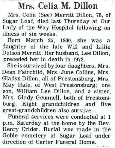 b. 06-26-1918 d. 10-02-1990 d/o Ed & Birdie Richardson Prater, w/o Amos Lester Dotson, bur Dotson Family Cem, Middlecreek