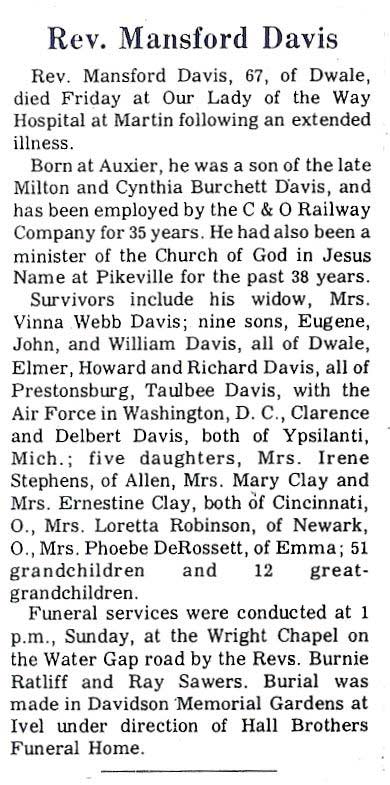Age 90 of David, Ky. passed from this life on Tuesday, August 8, 2006 at the Paul B. Hall Regional Medical Center in Paintsville, Ky. He was born at Hippo, Ky. on May 16, 1916 being the son of Alamander (Alka) Davis and Arena Hicks Davis. He was a retired coal miner and a member of the U.M.W.A. and the D.A.V. Chapter 128 at Garrett, Ky. Also a veteran of W.W.II having served in the U.S. Army. He is survive3d by the wife, Edna Mae Castle Davis. One Son, Floyd Davis of David, Ky. and a Daughter, Judith Hamm of David, Ky. Also surviving are: Two Sisters, Sarah Alice Reffitt of Hueysville, Ky. and Anna Shepherd of Willard, Ohio. 4 Grandchildren, 6 Great Grandchildren. Funeral Services: Friday, August 11, 2006 at 5:00 P.M. in the Hall FUneral Home Chapel at Martin, Ky. with Rev. Larry Adams officiating. Burial in the Davidson Memorial Gardens at Ivel, Ky. Friends can call for visitation from 3-9 P.M. Thursday at the Funeral Home and on Friday after 1:00 P.M. until Funeral Time.
