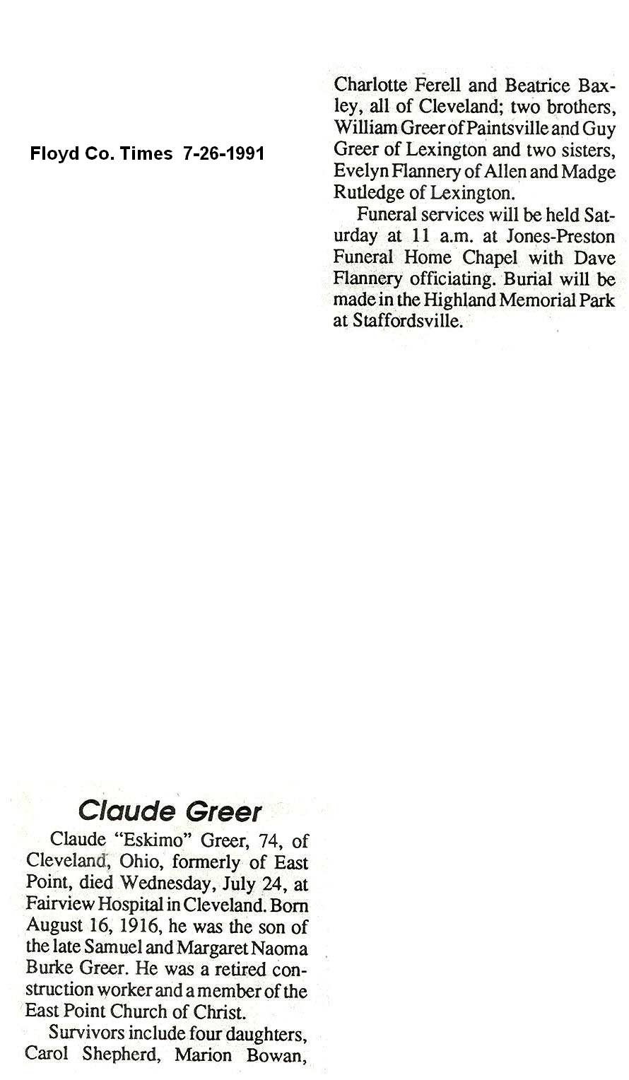 Age 86, of Paintsville, died Thursday, January 25, 2001, at the Mountain Manor Nursing Home, Paintsville. Born on October 25, 1914, in Johnson County, he was the son of the late Samuel Greer and Naomi Burke Greer. He was a retired employee of Jones-Preston Funeral Home. He is survived by his wife, Gertrude Crider Greer. Other survivors include three sons, William Ronald Greer of Tutor Key, Gary Greer of Little Paint Creek, Paul Roger Greer of Paintsville; two daughters, Alice Frazier of Thelma, Peggy Hall of Van Lear; one brother, Guy Greer of Lexington; two sisters, Madge Rutledge of Lexington, Evelyn Flanery of Allen; seven grandchildren and four great-grandchildren. Funeral services were conducted Saturday, January 27, at 11 a.m., at the Jones-Preston Funeral Chapel, with Dick Vanhoose and Dave Flanery officiating. Burial was in the Highland Memorial Park. (FCT'S)