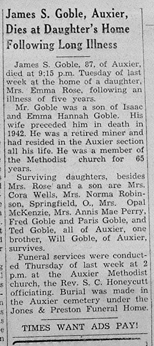 B: 3-1-1889 D: 2-21-1976, children: Marua, Phyllis, Margie, Fannie, Nayomia, Lena, Keith, Arnold,, James Michael, Norman, Kendall, Don and Hershall step-children: Feru, Fon, Dewey, Eugene, Audrey, Ella, Francis, Olive,, Robert and Bill h/o Mae Combs who also had 9 children of her own. No children were born to this union.