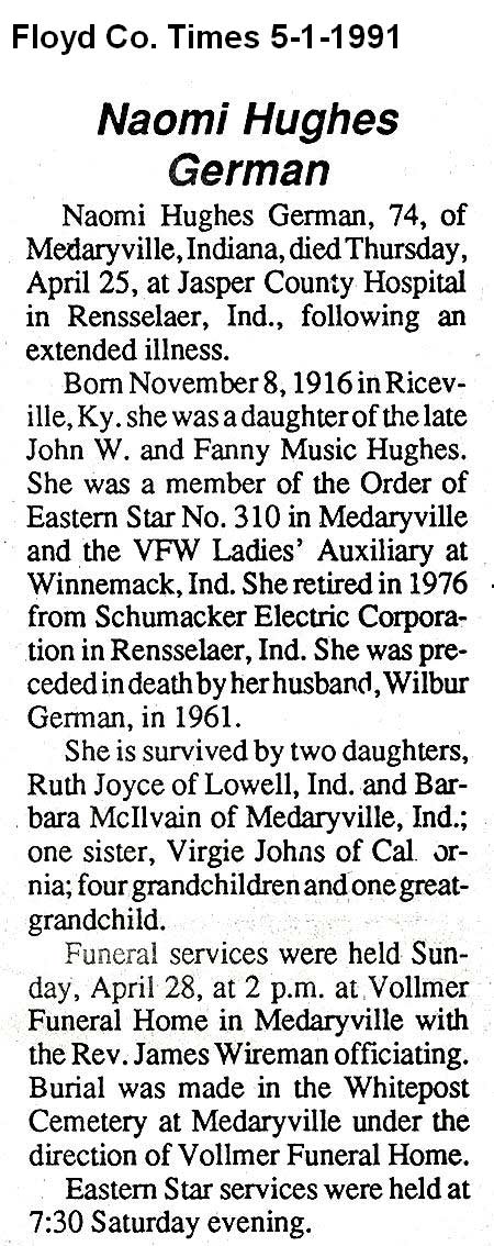 Age 81, b-Nov.03 1916-Floyd Co. d-Oct.09 1998 d/o William C. & Byrd Beavers Goble, w/o-Lawrence H. Gagle Bur: Springs Hill Cem. Fort Recovery, Ohio