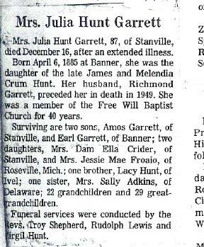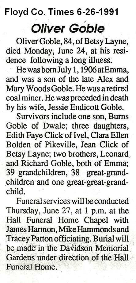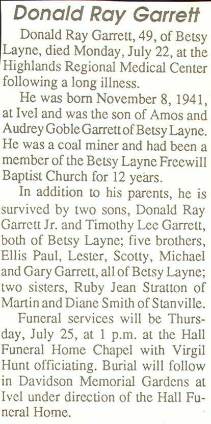 Age, 82, of Banner, died Friday, June 7, 1991 at Highlands Regional Medical Center. Born February 9, 1909 in Banner, he was the son of the late Richard and Alice Osborne Garrett. He was a retired miner who had worked for B & H Elkhorn Coal Company at Ivel and was a member of the Brandy Keg Freewill Baptist Church. Survivors include his wife, Fannie Endicott Garrett; one son, Joe Henry Garrettof Endicott; two daughters, Hettie Hunt of Prestonsburg and Rebial Lewis of Banner; one halfbrother, Amos Garrett of Betsy Layne; two half-sisters, Jessie May Froais of Roseville, Michigan and Damie Ellen Crider of Marietta, Georgia; eight grandchildren and 12 great-grandchildren. Funeral services were held Sunday, June 9, at Floyd Funeral Home with Brothers George David Garrett and Brody Amburgey, officiating. Burial was made in the Davidson Memorial Gardens at Ivel under the direction of Floyd Funeral Home. Serving as pallbearers were Dallas Justice, George David Garrett, Arco Hunt Jr., John Earl Hunt, Joey Reynolds, David Lee Garrett, Michael Goble and Dave Sipple. (FCT'S)