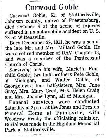 Submitted by From the scrapbook of Cora Coburn Meadows (FCT'S) GARRETT, Okie Elmer Age, 71, of Albion, Michigan, formerly of Emma, Kentucky, died Thursday, July 20, 2006. He left Kentucky in the early 50s. He still has lots of relatives and friends in Kentucky. Surviving are three daughters: Mary Cundiff, Cibble Bryant and Juanita Compton; two step-sons, Kenny Jerrell and James Jerrell, longtime companion, Pearline Reed; 12 grandchildren and 25 great-grandchildren. Arrangements, are by J. Kevin Tidd Funeral Home, 811 Finley Drive, Albion, Michigan. (FCT'S Aug 25, 2006)