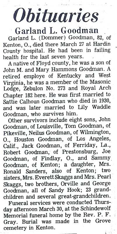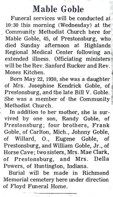 Age 55, of Roann, Indiana, died May 28, at Wabash Skilled Care Center in Wabash, Indiana. Born June 20, 1942 at Thomas, he was the son of the late Alie Griffey and Dulcie May Roop Griffey. . He was a member of the Christian Heritage Church in Wabash, Indiana. Survivors include his wife, Alberta Clark Griffey; two sons, Randell Griffey of Roann, Indiana, and Rick Griffey of Honolulu, Hawaii; seven brothers, Henry Griffey of Tampa, Florida, Paul Grifiey and George Griffey, both of Prestonsburg, Ester Griffey of North Manchester, Indiana, and Elmer Gdffey, Moses Griffey and Dean Smith, all of Wabash, Indiana; three sisters, Ruth Blankenship of Pikeville, and Marie Skeens and Martha Jane Murphy, both of Prestonsburg; and five grandchildren. Burial was in the Roann Community Cemetery in Roann, Indiana