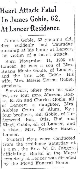 Age 84, of Dayton, Ohio, formerly of Price, died October 7, 1997, at Crystal Care Nursing Home in Dayton, Ohio, Born October 4, 1913 at McDowell, s/o Dingus and Rebecca Gayheart.. Survivors include two sons, Ronald Lee Gayheart and Robert Dingus Gayheart; two daughters, Carolyn Sue Judd and Diana Lynn Williams ; two brothers, Ted Gayheart and Elisha Gayheart ; four sisters, Ocie Gamble, Greta Gallagher, Madge Crocker, and Rhodina Singleton ; Burial will be in the Gayheart Cemetery at Price
