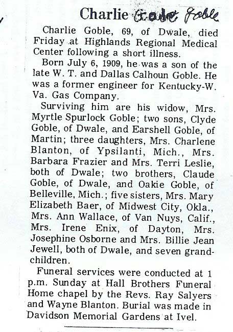Age 85, of Pikeville, died Dec. 2nd. at Pikeville Methodist Hospital. Born in Knott Co., Aug. 4, 1913, s/o the late Crockett and Elizabeth Sexton Criffith. Survivors include two brothers, Crockett Grifith Jr. and Corbitt Raymond Griffith; three dau., Susie Stambaugh , Beulah Mae Bayless and Pauline Porter. Burial was in Davidson Memorial Gardens at Ivel.