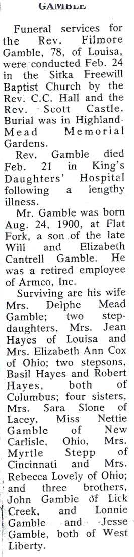 Age 81, of Paintsville, died Friday, December 29, 2000, at the V.A. Medical Center, Huntington, West Virginia. Born December 9, 1919, in Pike County, he was the son of the late Lawrence C. Gambill and Oma Drago Gambill. He was self-employed at Gambill"s Electric. He was a U.S. Air Force veteran. He is survived by his wife, Martha Leona Painter Gambill. Other survivors include one son, Michael Gambill, and one stepson, James G. Prater, both of Prestonsburg; two daughters, Virginia L. Gambill and Kathy Kirk, both of Paintsville; two brothers, Frank Gambill of Berea, Marvin Gambill of Cincinnati, Ohio; 12 grandchildren and 10 great-grandchildren. Funeral services were conducted Monday, January 1, 2001, at the Jones-Preston Funeral Chapel, Paintsville, with Rev. Wayne Fields and Rev. Jimmy Jennings officiating. Burial was in the Highland Memorial Park, at Staffordsville, under the direction of Jones-Preston Funeral Home. (FCT'S)