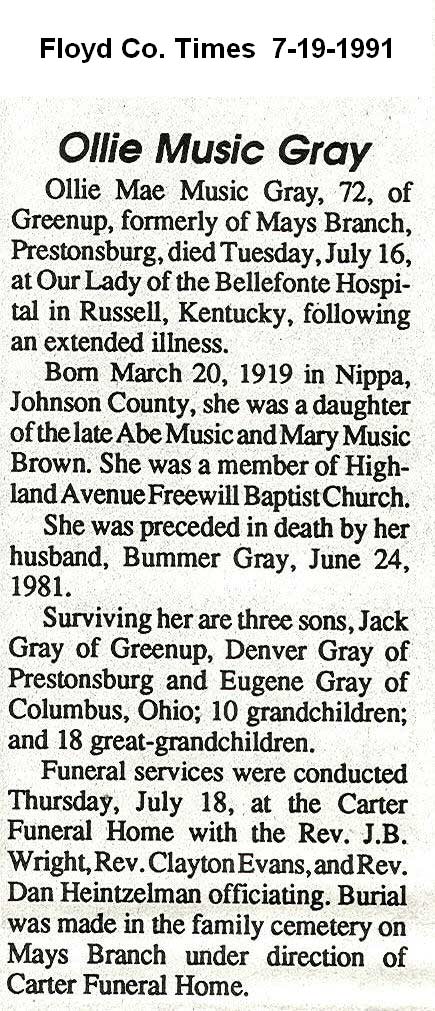 Age 66, of Allen, d. March 31, 1998, at the University of Kentucky Medical Center in Lexington, Born January 8, 1932 at Allen, s/o Galloway and Flora Lafferty Gray. He was a veteran of the Korean War. Survivors include one son, Frank G. Grey Jr; two daughters, Betty Ford and Gina Tuley Burial was in Davidson Memorial Gardens at Ivel