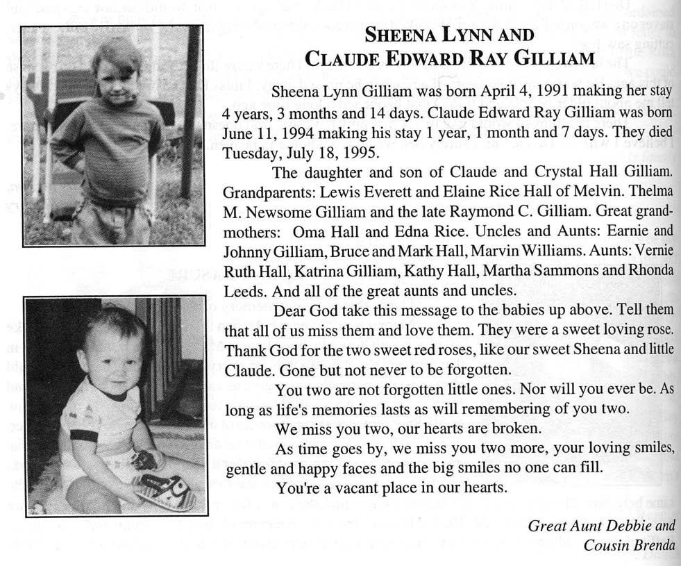 Age 11, of Langley, died Monday, May 10, 2004, in an automobile accident near Prestonsburg. Born June 24, 1992, at Martin, he was the son of William David Guess, of Langley, and the late Thelma Leigh Frasure Guess. He was a 6th grade student at Allen Central Middle School. In addition to his father, he is survived by his paternal grandparents, John and Charlotte George Guess, of Fleming County; his maternal grandparents, Billy Ross and Twila Cole Frasure, of Menifee County; his great-grandmother, Dixie Cole, of Martin; and several aunts, uncles and cousins. In addition to his mother, he was preceded in death by two brothers, David Lee Guess and Jimmy Alan Guess. Funeral services will be conducted Thursday, May 13, 2004, at 1 p.m., at the Nelson-Frazier Funeral Home, in Martin. Ronnie Spriggs will officiate. Burial will follow in the Guess Family Cemetery, at Flat Gap, in Johnson County. Visitation is at the funeral home. In lieu of flowers, donations may be made to the Nelson-Frazier Funeral Home, P.O. Box 1609, Martin, KY 41649, to be used for the Guess family funeral expenses. Arrangements, under the care of Nelson-Frazier Funeral Home. (FCT'S) GUESS, David Lee Age 13, of Langley, died Monday, May 10, 2004, in an automobile accident near Prestonsburg. Born February 3, 1991, at Martin, he was the son of William David Guess, of Langley, and the late Thelma Leigh Frasure Guess. He was a 7th grade student at Allen Central Middle School. In addition to his father, he is survived by his paternal grandparents, John and Charlotte George Guess, of Fleming County; his maternal grandparents, Billy Ross and Twila Cole Frasure, of Menifee County; his great-grandmother, Dixie Cole, of Martin; and several aunts, uncles and cousins. In addition to his mother, he was preceded in death by two brothers, Billy Edward Guess and Jimmy Alan Guess. Funeral services will be conducted Thursday, May 13, at 1 p.m., at the Nelson-Frazier Funeral Home, in Martin. Ronnie Spriggs will officiate. Burial will follow in the Guess Family Cemetery, at Flat Gap, in Johnson County. Visitation is at the funeral home. In lieu of flowers, donations may be made to Nelson-Frazier Funeral Home, P.O. Box 1609, Martin, KY 41649, to be used for the Guess family funeral expenses. Arrangements, under the care of Nelson-Frazier Funeral Home. (FCT'S)