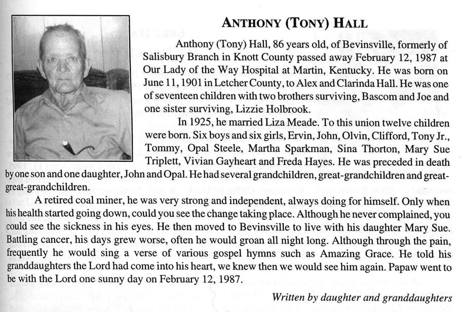 , Age 69, of Hi Hat, d. February 10, 1998,HRMC, Prestonsburg, Born March 28, 1928 in Floyd County, s/o Talt and Nannie Blankenship Hall. He was a member of the Samaria Old Regular Baptist Church at Teaberry. h/o Virginia Dryl Mitchell Hall, Burial was in the Reynolds Cemetery at Hi Hat