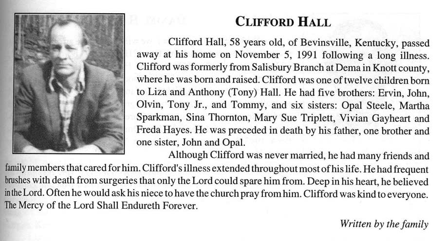 Age 82, of Prestonsburg, January 23, 1998, at H.R.M.C., Prestonsburg. Bom September 13, 1915 at Boldman, s/o Walter Hall and Lula Hatfield Hall. He was a member of the Church of Christ at Toler Creek h/o (1) Mindy Francis Newsome Hall (2) Virgie Parsons Hall; children: Cledas Hall , Charles Hall Catherine Meade , Brenda Hall ; stepchildren:, Linda Lyon , Henrietta Osborne; Stanley Niece ., Phillip D. Niece, and Russell Niece ; three brothers, John Hall , Lafe Hall, and Frank Hall of Teaberry; two sisters, Eula Lish, and Flora Bell Kirsteatter Burial was in the Meade Cemetery at Harold.