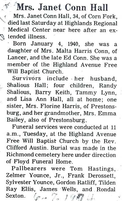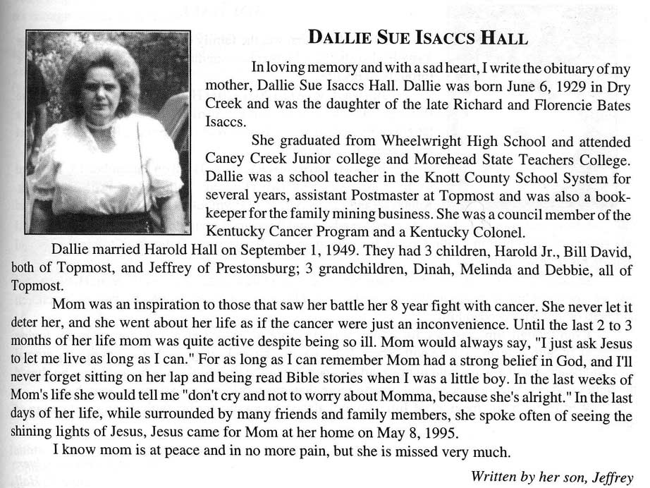Age 71, of Melvin, died Sunday, January 28, 2001, at Highlands Regional Medical Center, Prestonsburg, following an extended illness. Born on February 7, 1929, in Topmost, she was the daughter of the late Jonts Isaac and Victoria Cook Isaac. She was a member of the Martin Branch Freewill Baptist Church. She was preceded in death by her first husband, Howard Hicks. She is survived by her husband, Estill Hall. Other survivors include one son, Charles Hicks of Garrett; one daughter, Cathy Epling of Garrett; one brother, Berlin Isaac of Topmost; four sisters, Hesta Bates of Melvin, Flora Hall of Topmost, Gertrude Jones and Lillie Coleman, both of Columbus, Ohio; and four grandchildren. Funeral services will be conducted Wednesday, January 31, at 11 a.m., at the Nelson-Frazier Funeral Home, at Martin, with ministers of the Old Regular Baptist Church officiating. Burial will be in the Hicks Cemetery, at Garrett. (FCT'S) HALL, Sam, b. July 22, 1864, d. Feb 15, 1945, married Lynn Johnson. Had 11 children: Talt, d. bef 1945, Dick, d. bef 1945, Carline, Angeline, Bill, Martin, Vady, Alice, Mattie, Mary Ellen and Calvin