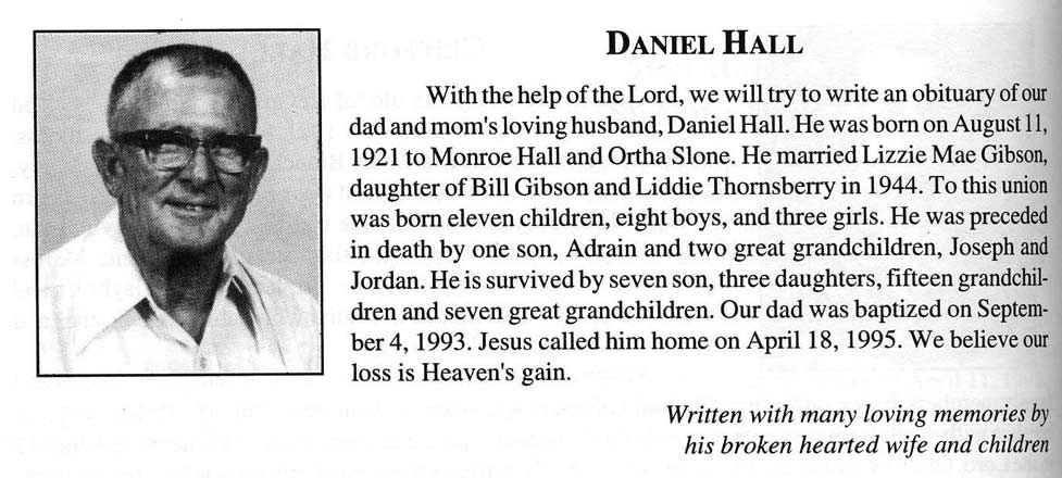 B: 8-6-1898 D: 9-23-1973, s/o Dave and Rosie Howell Hall, h/o Verdie Mitchell married: 2-4-1920, 7 children