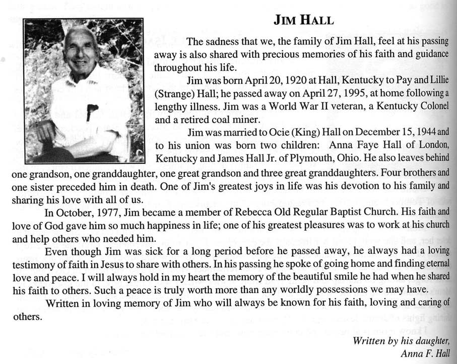 Age 78, of Robinson Creek, died Sunday, September 3, 2000, at Pikeville Methodist Hospital. He was born September 11, 1921, at Teaberry, a son of the late Talt and Nanny Hall. He was a retired coal miner and a member of the United Mine Workers of America. He was of the Old Regular Baptist faith. He is survived by his wife, Bertha Hall; five sons, Jimmy Hall of West Moreland, Tennessee, James Hall of Romulus, Michigan, Tommy Hall of Newport, and Clyde Hall and Burnis Hall, both of Robinson Creek; three daughters, Patty Compton of River Rouge, Michigan, Olive Pearl Caylor of Ecorse, Michigan, and Juanita Hall of Robinson Creek; one sister, Nellie Newsome of Beaver, and several grandchildren and great-grandchildren. He was preceded in death by two sons, Chester and Junior Hall. Funeral services are today, September 6, at 11 a.m. at the R.S. Jones and Son Funeral Home Virgie Chapel. Ministers are Dewey Roberts, Monroe Jones, Teddy Honaker, Vernon Damron and Leonard Kiser. Interment will be in the Sam Hall Cemetery at Bear Fork of Robinson Creek. (FCT's)