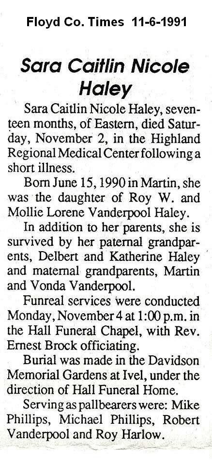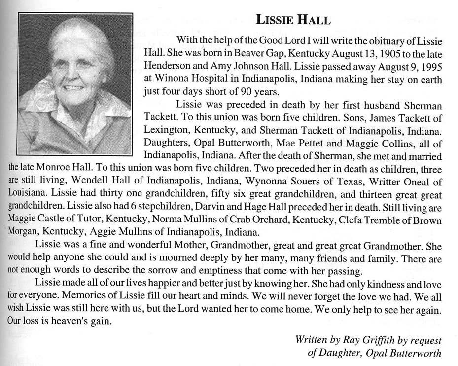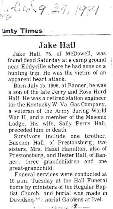Obituary, The Floyd County Times, Prestonsburg, Kentucky, Wednesday, 26 September 1973, section 1, page 8. Sie Hall, 75 years old, of Printer, died Sunday at Our Lady of the Way hospital at Martin. A son of the late David and Rofie (should read Rosie) Howard (should read Howell) Hall, he was born at Craynor, August 6, 1898. Preceded in death by his wife, Verdie Mitchell Hall, who died in 1972, he was a retired miner from the Hamilton Coal Company and a member of the Zion Regular Baptist Church. Survivors include a son, Sie Hall, Jr., and a daughter, Frances Hall, both of Craynor and one sister, Mrs. Viola Mitchell, of Teaberry. Fifteen grandchildren and 23 great-grandchildren also survive. Funeral services were conducted Wednesday at 10 a.m. at the home with ministers of the Regular Baptist Church officiating. Burial was made in the Ike Roberts cemetery at Grethel under the direction of the Hall Brothers Funeral Home.