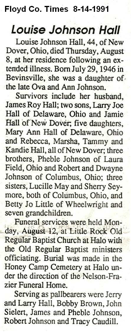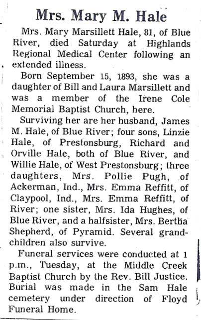 Age 81, of Springfield, Ohio, formerly of Wheelwright, died Wednesday, November 5, 1997, at Pillars Healthcare, Born January 8, 1916 in Wheelwright, d/o Odie and Nancy Hall Little. w/o (1) Marion Hall, (2) Berlin Hall. Survivors include one son, Clark Hall of Xenia, Ohio; one stepson, Ray Hall of West Virginia; five daughters, Marie Little of Wheelwright, Manda Hall and Brenda Hall, both of Cedarville, Ohio, Marcella Wallen of Portsmouth, Ohio, and Mary Hawes of Springfield, Ohio; two stepdaughters, Mildred of California and Ruth Wright ; two sisters, Ella Bentley and Lissie Sowards . Burial will be in the Little Cemetery at Bypro