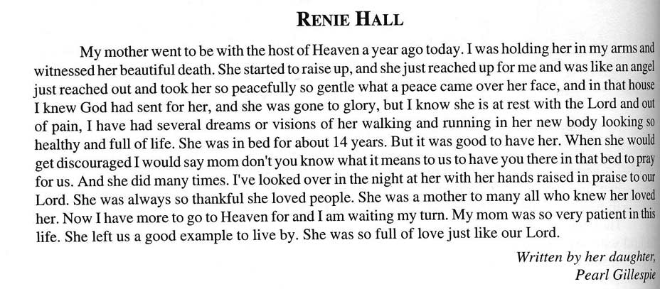 Age 75, of Wayland, died Thursday, December 7, 2000, at the McDowell Appalachian Regional Hospital, following an extended illness. Born on August 20, 1925, in Breathitt County, she was the daughter of the late Fred and Anna Mae Isaac Sparkman. She was a member of the Little Country Church, Wayland. She is survived by her husband, Clester Hall. Survivors include four sons, Jimmy Darrell Hall and Ralph Hall, both of Wayland, Burnis Dean Hall of Lackey, David Glen Hall of Columbus, Ohio; two daughters, Jessie Mae Patton of Garrett, Anna Sue Crager of Wayland; one brother, Jesse Sparkman of Garrett; 13 grandchildren, three great-grandchildren. Funeral services will be conducted Sunday, December 10, at 11 a.m., at the Little Country Church, Mill Creek, Wayland, with Grant Hurley, Harold Howard, Clint Howard and Tommy Collett officiating. Burial will be in the Hall Family Cemetery, Wayland, under direction of Nelson-Frazier Funeral Home, Martin. (FCT'S)
