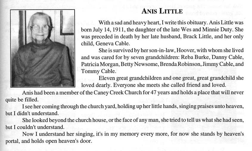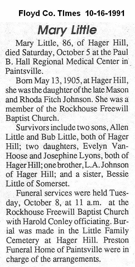 Age 71, of Melvin, Ky., died Saturday, March 16, 2002, following an extended illness. Born on Tuesday, March 26, 1930, in Pinetop, Ky., she was the daughter of the late Van and Nan Vance Hall. She was a homemaker. She is survived by her husband, David Little. Other survivors include three sons, Jerry (Sharon) Little of Price, Ky., Kenny Little of Maytown, Ky., and David Lee (Boo) Little of Melvin, Ky.; two daughters, Debbie Mullins of Ashboro, N. C., and Libby Anderson of Bevinsville, Ky.; one brother, See Hall of Kite, Ky.; one sister, Kathleen Gibson of Michigan; and 11 grandchildren, Brian, Michelle, Chris, Ryan, Jason, Dustin, Cory, Brandy, Randi, Ashley, and Amanda; and a special friend, Rex Vicars of Melvin, Ky. She was preceded in death by one brother, Willie Hall; three sisters, Daisy Burger, Celeste Bates, and Maggie Vance. Funeral services were conducted Tuesday, March 19, 2002, at 1 p.m., at the Joppa Old Regular Baptist Church, Melvin, Ky., with ministers of the Old Regular Baptist Church officiating. Burial was in the Little Family Cemetery, Melvin, Ky., under the direction of Nelson-Frazier Funeral Home, Martin, Ky. Visitiation was at the Joppa Old Regular Baptist Church. (FCT'S)