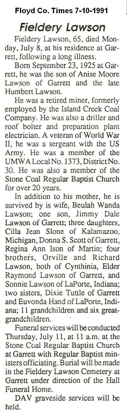 Age 80, of Betsy Layne, died Sunday, May 5, at his residence. He was a son of the late Ben and Ivy Amburgey Lynch, and was born December 5, 1910, in Pike County. He was a retired employee for Wyandotte Chemical Company in Wyandotte, Michigan. A veteran of World War II, he was a member of the DAV Chapter 169 at Betsy Layne. He was also a member of the Calvary Baptist Church at Betsy Layne. Surviving him are his wife, Virgie Walker Lynch; two daughters, Linda Lou Molina of Schurtz, Texas and Alva Jean Hall of Betsy Layne; one sister, Alva Marie Fannin of Betsy Layne; and two grandchildren. Funeral services will be conducted Wednesday, May 8, at 1 p.m. at the Nelson-Frazier Funeral Home with the Rev. Cohen Campbell and the Rev. Lewis Walters officiating. Burial will be made in the Davidson Memorial Gardens at Ivel under direction of the Nelson-Frazier Funeral Home. (FCT'S)
