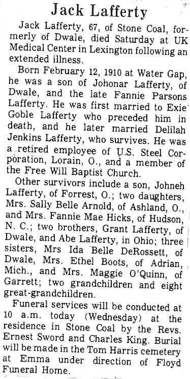 Age 77, of East Point, died Saturday, March 17, 2001, at his residence. He was born February 26, 1924, in Edgar, a son of the late J. L. and Eva Collins Lafferty. He was a retired auto mechanic, formerly employed by Music-Carter-Hughes Chevrolet, a disabled American veteran, and a member and deacon of the Bonanza Freewill Baptist Church. He is survived by his wife, Mildred Tackett Lafferty. Other survivors include one son, Scott Lafferty of Paintsville; two daughters, Carolyn Gatewood of Winchester, Toni Briggs of St. Petersburg, Florida; three brothers, Henry Lafferty and Johnny Lafferty, both of Cliff, Darwin Lafferty, of (Calf Creek), Prestonsburg; three sisters, Mazie McCarron of Flat Rock, Michigan, Roberta Crider of Prestonsburg, Pauline Jones of Sebring, Florida; nine grandchildren, and six great-grandchildren. Funeral services were conducted Tuesday, March 20, at 11 a.m., in the Bonanza Freewill Baptist Church, with Jimmy Brown and Van West officiating. Burial was in the Highland Memorial Park, at Staffordsville, under the direction of Hall Funeral Home, Martin. (FCT'S)