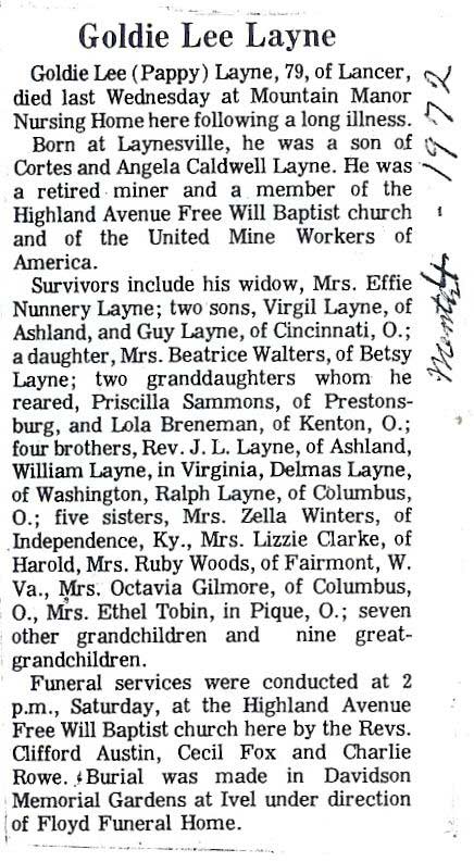 58, of Columbus, Ohio, formerly of Allen, died Saturday, Sept. 8, 1990, at his home. Born Feb. 22, 1932, at Allen, s/o Willie Fred Lafferty and Goldie Lafferty of Inez. He lived most of his adult life in Ohio . h/o Esther Davis Lafferty; two sons and daughters-in-law, Gregory and Jan Lafferty and Geoffrey and Carla Lafferty, all of Columbus; two grandchildren, Brandon and Brooke Lafferty; six brothers, Charles, Donnie and Freddie Lafferty of Martin, Jimmy Lafferty of Rosamond, Calif., Elmer Lafferty of Inezand Harry "Gene" Lafferty of Albion, Mich. He was preceded in death by his brother, Gary Franklin Lafferty. Burial in the Franklin Hills Memory Gardens