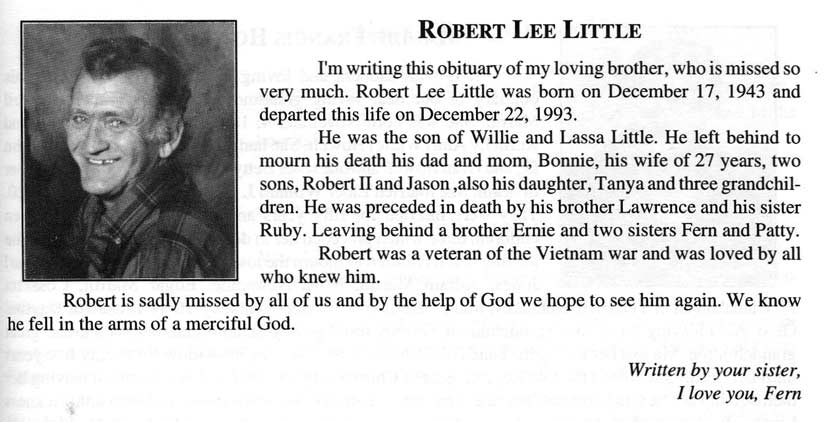 Age 57, of Lebanon, Ohio, formerly of Dema, died last Thursday, August 13, at the Kettering Medical Center in Dayton, O., following a brief illness. He was born November 16, 1929 at Dema, a son of the late Dennis and Dona Tackett Little. An electrician for Wagner Smith Company in Dayton, he was a member of the International Brotherhood of Electrical Workers, Local Union No. 82. He is survived by his wife, Evelene Webb Little, one son, Thomas G. Little, of Lowell, Mass.; one daughter, Shelia Little Pummill, of Lebanon, O.; one brother, Malcom Little, of Price; five sisters, Jeanette Mullins and Adith Morris, both of Hippo, Mamie Sturgill, of Wayland, Gracie Johnson, of Hi Hat, Lora Layne, of Dema, and three grandchildren. Funeral services were conducted Monday at 11 a.m. at the Pilgrim Rest Regular Baptist Church at Price with Ray Shelton, and other Regular Baptist ministers officiating. Burial was made in the Little family cemetery at Price, under direction of the Hall Funeral Home. (FCT'S Prestonsburg, Kentucky, Wednesday, 19 August 1987, section 1, page 12.) LITTLE, Thomas Jefferson, " T. J. ", Age 67, of Melvin, Died Thursday, September 9, 1999, at Pikeville Methodist Hospital. Born on April 17, 1932, in Floyd Co., he was the son of the late Willard Little and Liza Little Cook. Burial will be in the Little/Sie Hall/Wheelwright City Cemetery at Wheelwright. Children: Vicki Little Adkins, Kenny Little, Pamela Denise Little Ranier, and Robin Dean Little.