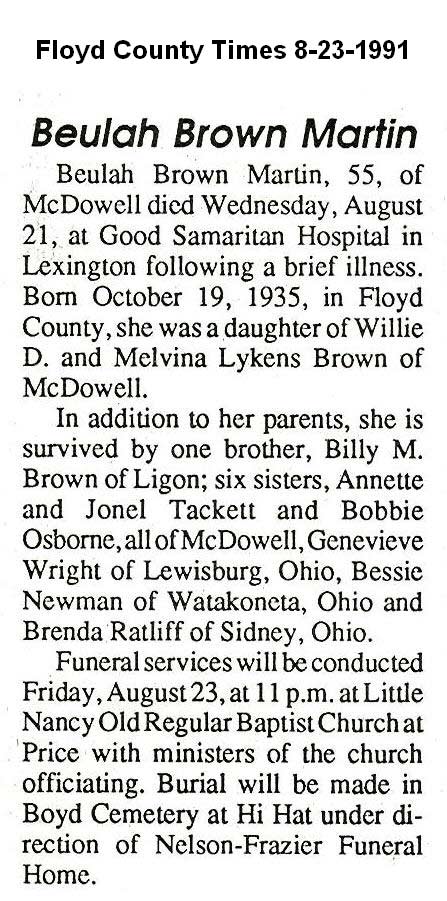 Age 65, of Drift, d. September 16, 1997, at the University of Kentucky Medical Center in Lexington,. Born July 10, 1932, in Floyd County, d/o Canterberry and Alice Moore Osborne. w/o Dennis Martin; four sons, Wade Martin ,Denzil Martin, both, Tanzil Martin, and Merlin Martin; three daughters, Donna Castle, Reba Martin, and Freda Martin ; three sisters, Phyllis Lafferty ,Imogene Althoff and Rhoda Candill Burial will be made in the Martin Cemetery at Drift