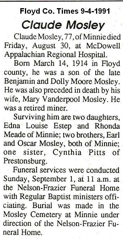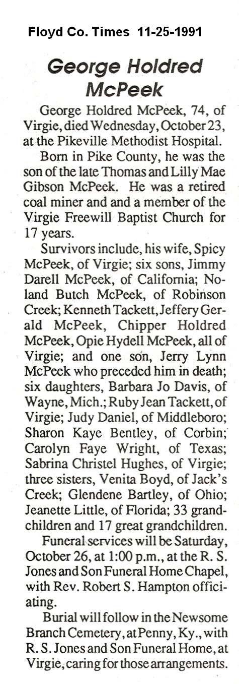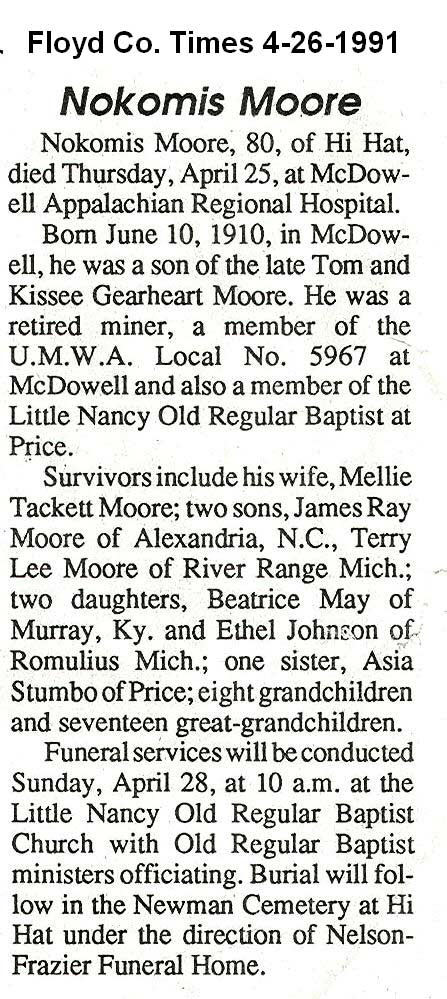 1909-1993 Retired miner, Okra Music, 84, died Sunday, December 12 1993 at Highland Regional Medical Center, in Floyd Co Ky. Mr. Music was born October 29 1909, in Floyd County, the son of the late William Jefferson and Laura Honeycutt Music He was a member of the Whitaker Freewill Baptist Church. He was preceded in death by his wife, Hazel Spencer Music, in June 1992. Surviving are one son, Donald Ray music of Nippa; two brothers, Ted Music of New Port, Virginia; and Abe Music of Dawson Springs; two sisters, Carrie Wells of Auxier; and Edna Sherman of Georgia; and 14 grandchildren and nine great grandchildren. Funeral services were held Wednesday, December 15 at Preston Funeral Home Chapel, with Bennt Taylor officiating. Burial was in Music Family Cemetery at East Point. Submitted by Darrell Music music298@verizon.net