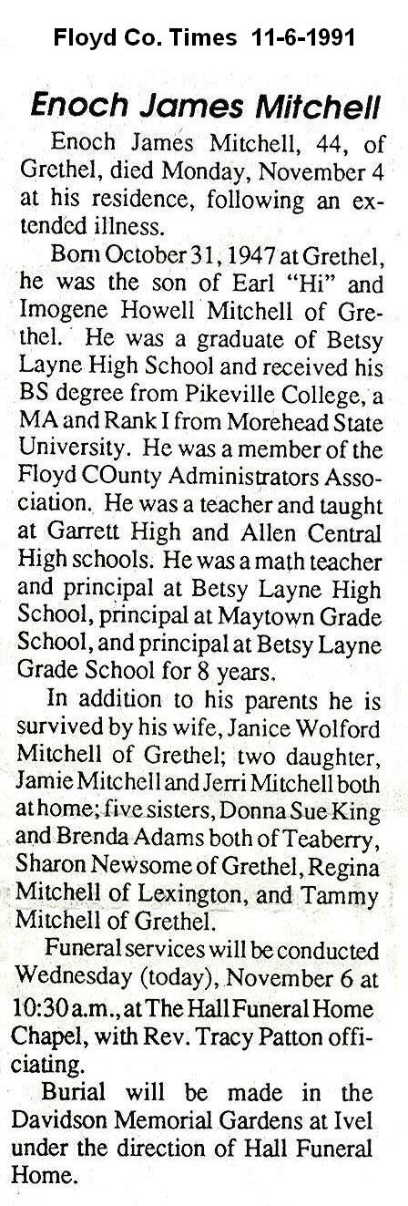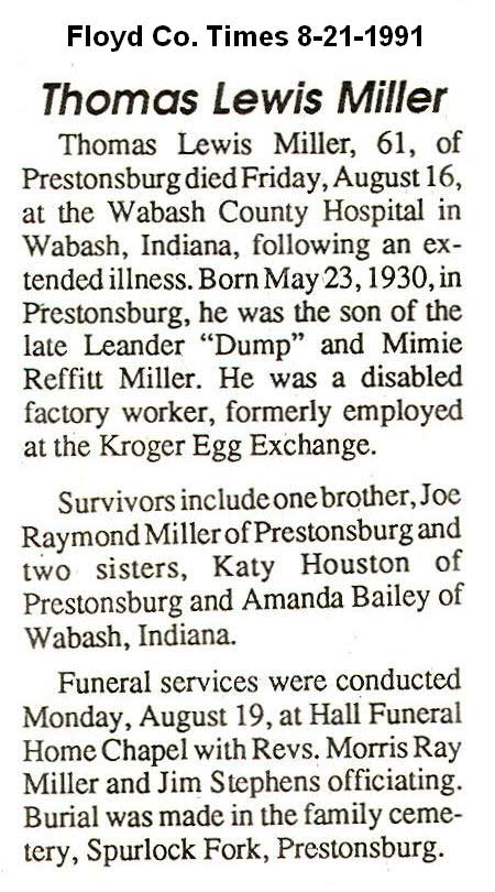 1914-1995 Age, 80, died Thursday, April 27 1995 at Highlands Regional Medical Center, FLoyd Co Ky. Mr. Music was born August 12, 1914, in Floyd County, the son of the late W.L. Music and Hattie C. Stone Music. He was a retired chief field agent from Kentucky West Virginia Gas Company, member of Little Paint First Church of God and National Management Association and a World War Il Army veteran. Also preceding him in death were two brothers and one sister. Serving are his wife, Eunice Burke Music; two sons; Ronnie Music of Auxier and Mearl Music East Point; two brothers, Dewey and Bobby Joe Music both of East Point; five sisters, Alta Mere Howard and Hazel Baldridge, both of East Point, Nell Ross of Michigan, Mary Badgett of Finley, Ohio and Gertrude Auxier of Hager Hill; and four grandchildren. Funeral services were held Saturday, April 29 at Jones-Preston Funeral Home Chapel, with Wayne Burch officiating Burial was in Music Family Cemetery at East Point. Submitted by Darrell Music music298@verizon.net