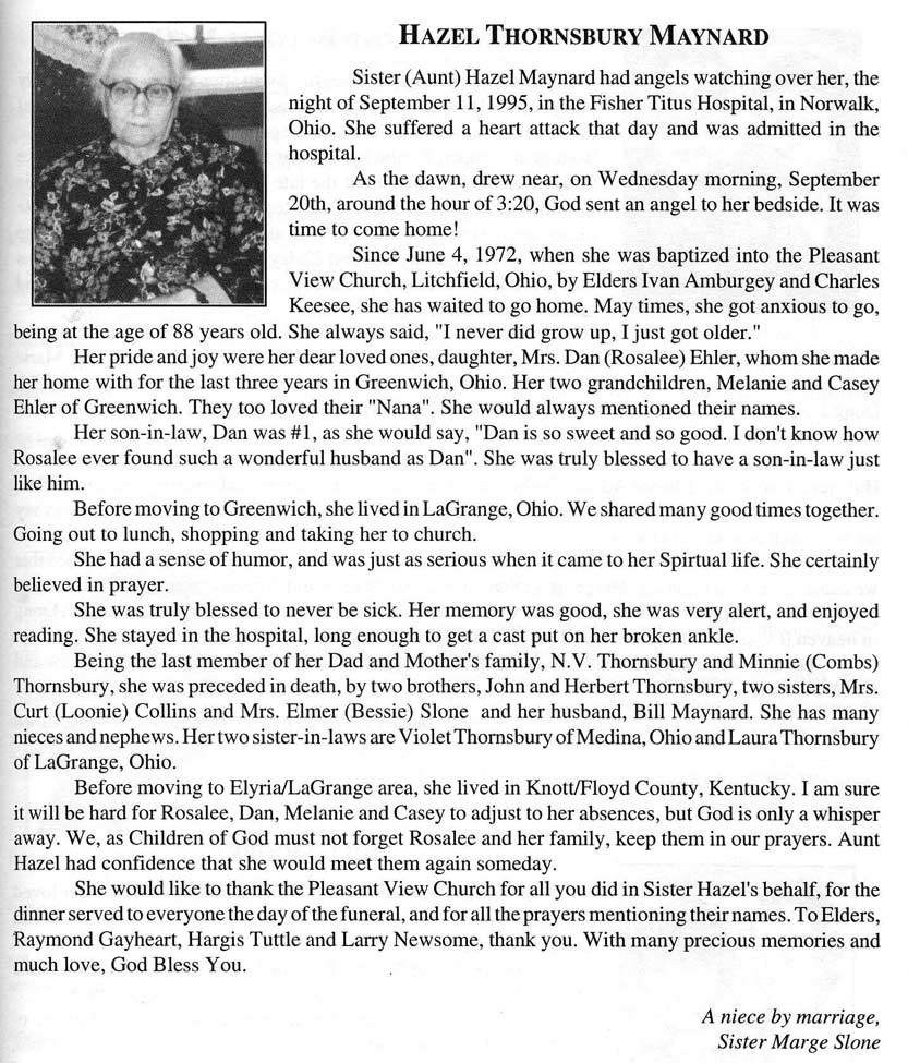 1922-1996 Olive Grace MUSIC, 74, of East Point Ky died June 20, 1996 at her home of an extended illness. Born January 10, 1922 in FLOYD CO, KY. She was the daughter of the late Samuel K. Music and Nora Bell Virginia Davis Music. She is survived by her daughters, Betty Baldridge Schuster of Abbott Creek, and Joyce Ann Compton Post of Portsmouth, Ohio, one brother, Edward C Music, of Prestonsburg ; two sisters, Malta Music Rice of East Point , Goldie Music Collins of Prestonsburg, grandchildren and ggrandchildren. Burial in the Music Family Cemetery at East Point condensed from The Floyd Co Times June 21, 1996 NOTE: At one time Olive & family lived in the old Samuel K. Music farm near East Point, Ky Submitted by Darrell Music music298@verizon.net