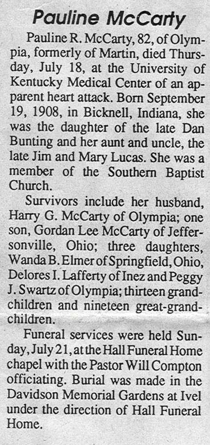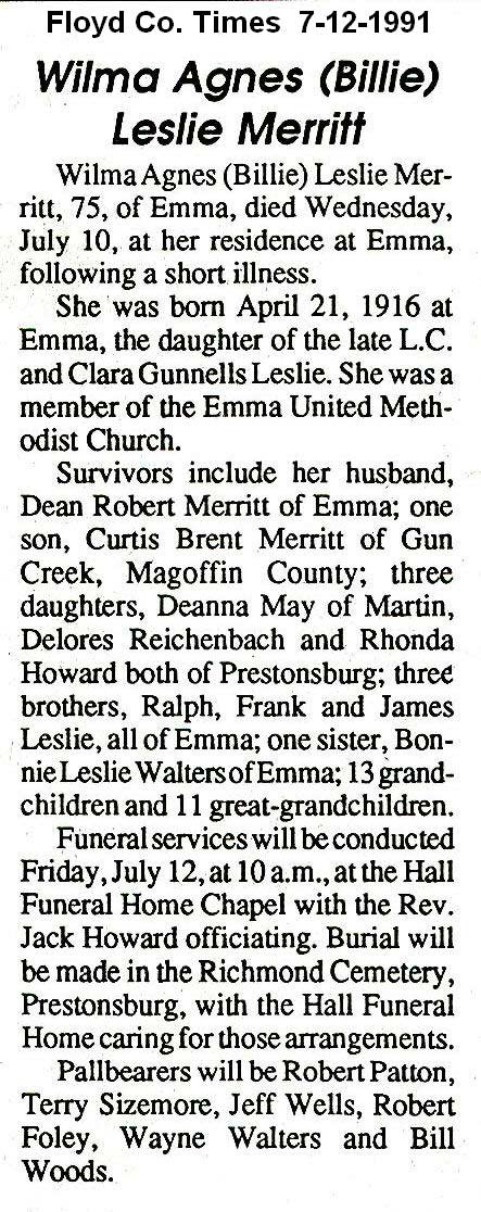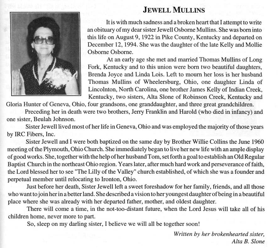 , Age 84, of Pikeville, died Sunday, June 21, 1998. Born January 17, 1914 in Pike County, she was the daughter of the late Virgie Hy[ton Smallwood and Adam Smallwood. She was a memeber of the Meta Baptist Church. She was preceded in death by her husband, Fonso Mullins. Survivors include four sons, Gary Blaine Mullins and Dale Craig Mullins, both of Pikeville, Lowell Reid Mullias of Lexington and Stoney Eric Mullins of Kimper; three daughters, Sherry Gwynn Bundy of Pikeville, Grathley Gall Reed of Chicago, Illinois, and Regis Lynne Mattingly of Ashland; four sisters, Mae Fleming, Sydney Dalton and Sue Scott, all of Pikeville, and Janice Hall of Betsy Layne, Burial was in the Mullins Family Cemetery at Dorton