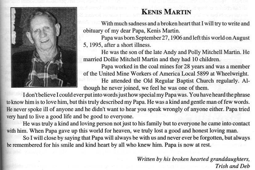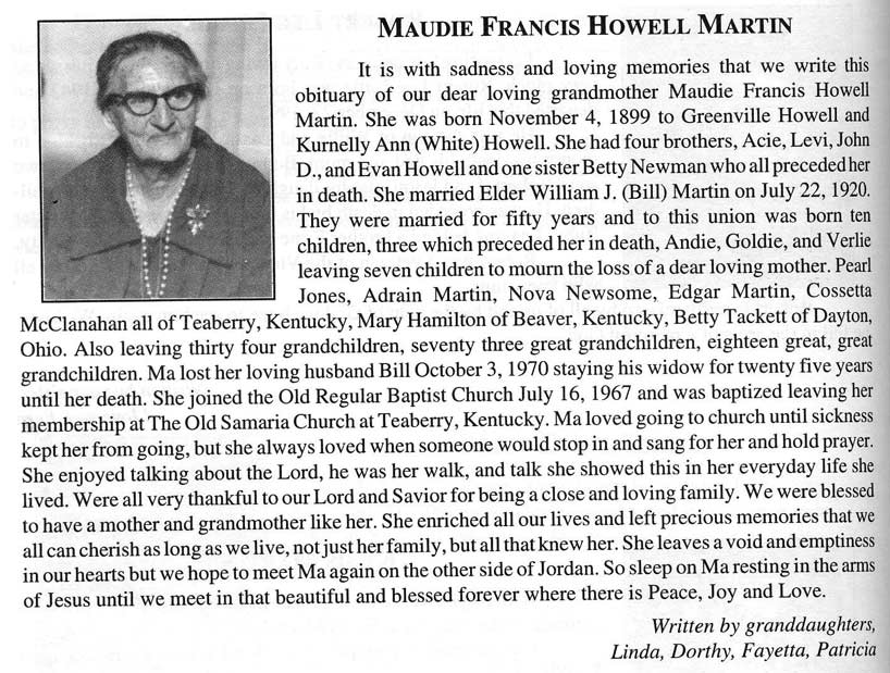 Age, 97, of Westland, Michigan, formerly of Harold, died Monday, March 19, 2001, at her residence. She was born March 23, 1903, in Grethel, the daughter of the late George and Arminia Frasure. She was a member of the Grethel Missionary Church. Her husband, Evan Martin, preceded her in death. She is survived by one son, Elmer Martin of Grethel; two daughters, Helene Joseph of Toledo, Ohio, and Lucy Stephenson of Westland, Michigan; one sister, Nora Tackett of Dayton, Ohio; 17 grandchildren, several great-grandchildren, and great-great-grandchildren, and one great-great-great-grandchild. Funeral services will be conducted Friday, March 23, at the Hall Funeral Home Chapel, Martin, with pastors of the church officiating. Burial will be in the Arminia Frasure Martin Cemetery, at Harold. (FCT'S)