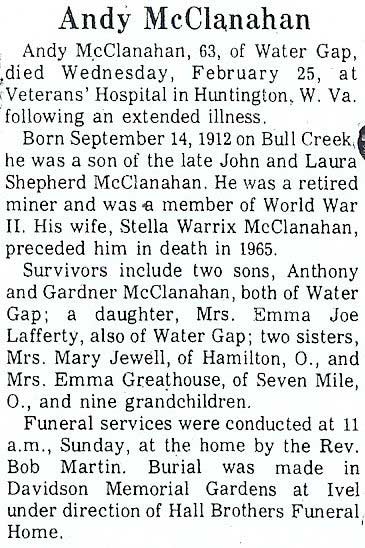 b. 3-27-1920, Auxier, F. C., d/o George W. and Elizabeth Rice Music, d. Aug 28, 1988, F .C., brothers: Alvis, Chester, Jack, sisters: Loretta, Clara, Frances, Irene, Brenda bur: Music Fam Cem, Auxier