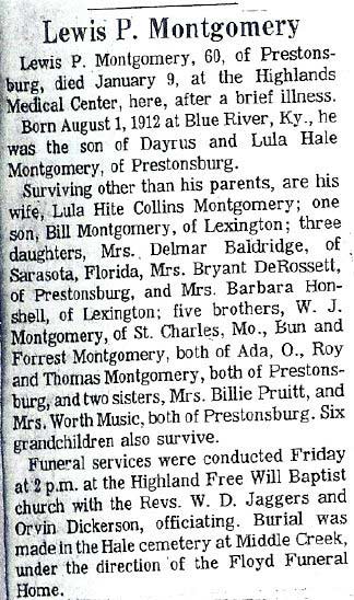 Age 89, of Prestonsburg, widow of Worth Music, passed away Tuesday, October 10, 2006, at the Highlands Regional Medical Center, Prestonsburg. She was born November 6, 1916, in Blue River, Prestonsburg, the daughter of the late Dayrus Montgomery and Lula Hale Montgomery. She taught school for several years and retired from Big Sandy RECC. She was a member of the Highland Avenue Freewill Baptist Church. Survivors include a son, Tom Ed Music of Prestonsburg; a brother, Roy Montgomery of Prestonsburg; a sister, Thelma Pruitt of Abbott Road, Prestonsburg; six grandchildren: Rhea Lynn, Elizabeth Ann, Bill Worth, II., Deborah, Vicki and Elisse and 11 great-grandchildren. Preceding her in death was her husband, parents; and a son, Billy Worth Music; seven brothers, L.P. Montgomery, Bill Montgomery, Henry Montgomery, Bun Montgomery, Forrest Montgomery, Thomas Montgomery, and Bert Montgomery. Funeral services were conducted Thursday, October 12, at 2 p.m., at the Hall Funeral Home Chapel, in Martin, with Clergymen Clifford Austin and Dave Garrett officiating. Burial was in the Richmond Cemetery, Prestonsburg, under the professional care of the Hall Funeral Home. Visitation was at the Funeral Home. Pallbearers: Robert May, Michael Hackworth, Ben Hale, Curtis Risner, Tommy Hale, and Doug Montgomery. Honorary: Clarence Risner and Roy Hackworth. (FCT'S 10-18-2006)