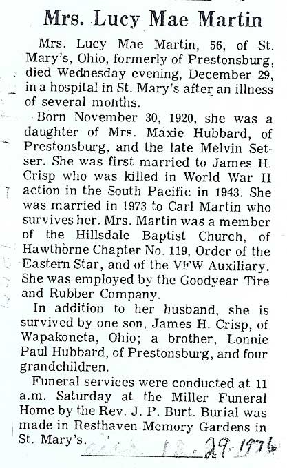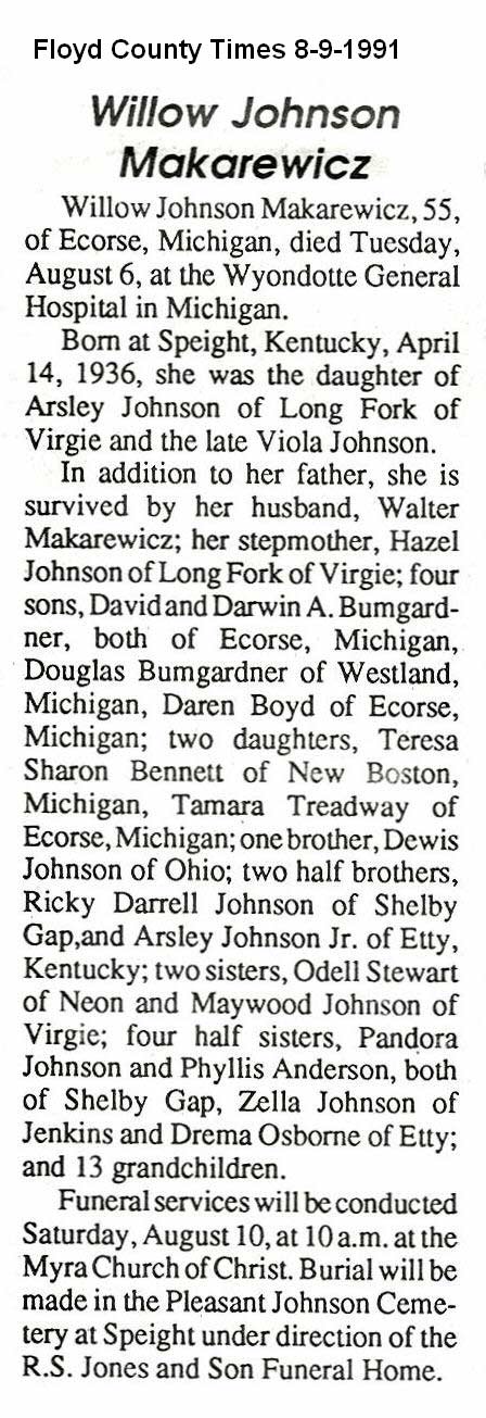 b-May 09 1917 Melvin, Ky d-Jul.04 1998 d/o-Billy & Darcus Little Johnson w/o-Muriel Martin Bur: Buckingham Cem. Floyd County, Ky.