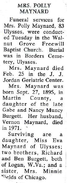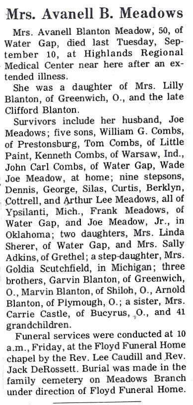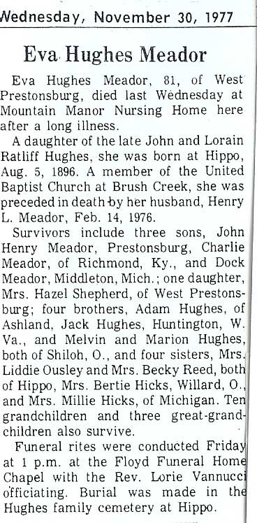 1906-1981 Nancy Music, 74, died Tuesday, January 13, in Highland Regional Medical Center. Born December 26, 1906, in Floyd County, she was the daughter of Levi and Malissia Stanley Blackburn. She was a resident of East Point and a member of the Church of Christ. Her husband, John Music, preceded her in death January 25, 1974. Surviving is a sister, Johnnie Blackburn Crisp, Prestonsburg. Funeral services were held Thursday, January 15, in Jones-Preston Funeral Home Chapel with Dave Flannery officiating. Burial was in Richmond Cemetery, Prestonsburg, with Jones-Preston Funeral Home in charge of arrangements. Paintsville Herald Wednesday January 21, 1981 Submitted by Darrell Music music298@verizon.net
