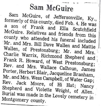 1948 Grant Music, 77, veteran of the Spanish-American War, died June 27 1948 in a hospital in Miami, Florida, after a short illness. Mr. Music had recently visited relatives here and in Floyd County and he suffered a stroke shortly after returning to his home in Florida. Born in the Little Paint section of Floyd County, he was a son of the late Thomas M. and Melissa Wilson Music. He is survived by one sister, Mrs. Anna Auxier, of East Point, several sons and daughters, and a host of other friends and relatives in this section. PAINTSVILLE HERALD WEDNESDAY Nov.12 1958 Submitted by Darrell Music music298@verizon.net MUSIC, Hattie May (England) 1908-1972 NORTH MANCHESTER - Mrs. Hattie May Music, Roann R.R. 1, died unexpectedly at her residence at 1 p.m. Monday. She was a native of Floyd County, Ky., born May 6, 1908 to Mr. and Mrs. William England. She had lived here since 1943. She married George W. Music May 18, 1926 and he survives with eight children, Mrs. Charles (Mary) Ross, Rapid City, S.D.; Frank Music, Mrs. Lloyd (Mildred) Hoffman, Charles Music, Mrs. Charles (Helen) Fitzgerald, all of North Manchester; George C. Music, Mrs. Robert (Ruth) Abshire, both of Wabash, and Bill Music, Laketon. Also surviving are 19 grandchildren and the following brothers and sisters, Mrs. Clora Miller and Mrs. Eva Slone, both of Kentucky; Silas England, Indiana; Mrs. Vica Hopkins, Warsaw, and Mrs. Maude Allen, Silver Lake. Friends may call after 7 p.m. today at the Bender Funeral Home. Services are scheduled there at 2 p.m. Thursday with the Rev. Glen Correll officiating. Burial will be in the Laketon Cemetery. Wabash Indiana April 25, 1972 Submitted by Darrell Music music298@verizon.net - MUSIC, Inez (Reid) 1914-1996 Inez Reid Music, of Auxier, died Monday, September 9, 1996 at the Highland Regional Medical Center. He was born in Lehi, Alabama, the daughter of Miles and Birdie Mohon Reid. She is survived by four sons, Mr. Charles Music of Auxier; Mr. Jerry Music of east point; Mr. Ben Music of Fort Wayne, Ind.; Mr. Kenneth Music of Beaver, Ohio; three daughters, Mrs. Ruth Ann Scott of Prestonsburg; Mrs. Ellie Goble of Stanton; 1 sister, Mrs. Darlene Lewis of Gatlinburg, Tenn., 16 grandchildren and 21 great-grandchildren. Services were September 11 at the Auxier Freewill Baptist church with the Reverend bobby Joe Spencer officiating. Burial services were in the Richmond Cemetery in Prestonsburg. Paintsville Herald September 1996 Submitted by Darrell Music music298@verizon.net