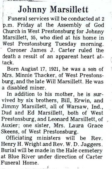 b. 7-31, 1895, Blue River, F. C., d. 3-6-1988, Pike Co KY, s/o Leonard and Ella Owens Marsillett, h/o (1)Annie Reffett, (2)Annie Hobbs, bur: Jack Arnett Cem, Middlecreek, Prestonsburg, KY
