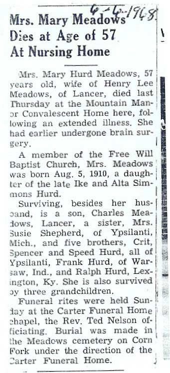 Obit Submitted by From the scrapbook of Cora Coburn Meadows (FCT'S)