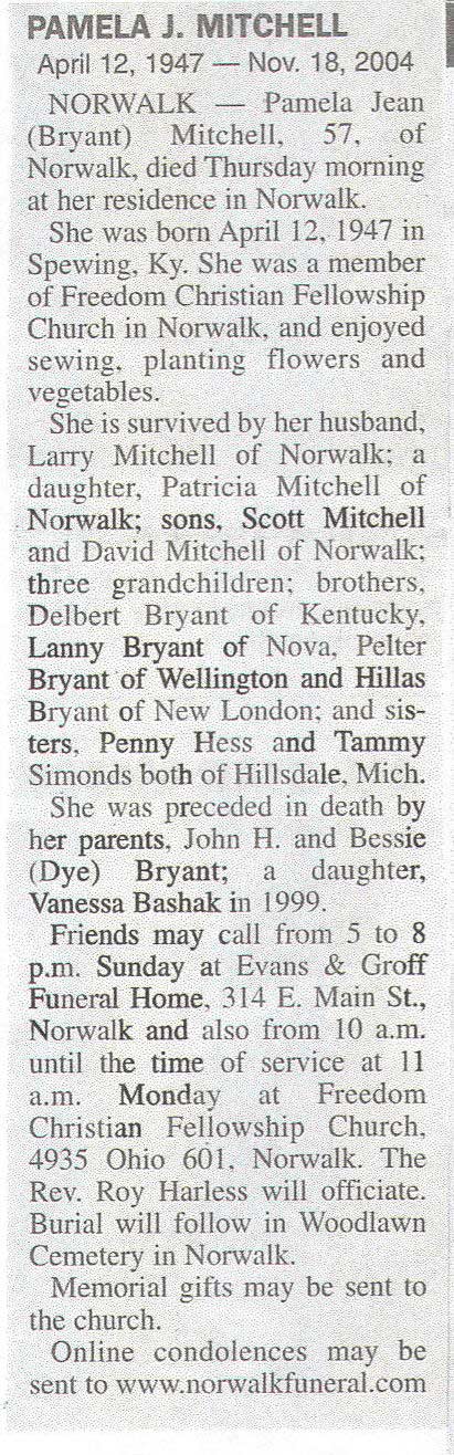 Age: 39 OF: McDowell, KY Date of Birth: October 13, 1968 Place: Kenderville, IN Date of Death: Wednesday July 9, 2008 Where: McDowell ARH Facts of Importance: night watchman for MCI Parents: Avanell Sparkman Kidd of McDowell & the late Kermit Tyrome Murphy Other Survivors: two sons: Earl Combs Murphy & Matthew Combs Murphy both of Columbus, OH; daughter: Shelby Lynn Paige Murphy of Wayland; four brothers: Terry Glen Caudill of Hueysville, Mitchell Lewis Murphy of Garrett, Jeffery Murphy of McDowell & Kermit Murphy Jr of Columbus, OH; three sisters: Sherry Caudill of Printer, Melinda Hall of Ashland & Carolyn Clay of Columbus, OH; nieces: Pamela Niece & Jennifer Marcum, a host of other nieces and nephews. Deceased Relatives: father Time and Place of Services: Saturday (July 12, 2008) 1 PM at Little Rosa Old Regular Baptist Church of the New Salem Association Officiating: Old Regular Baptist Ministers Visitation: Thursday after 7pm at the church Burial: Union Cemetery- Eastern, KY (NFH)
