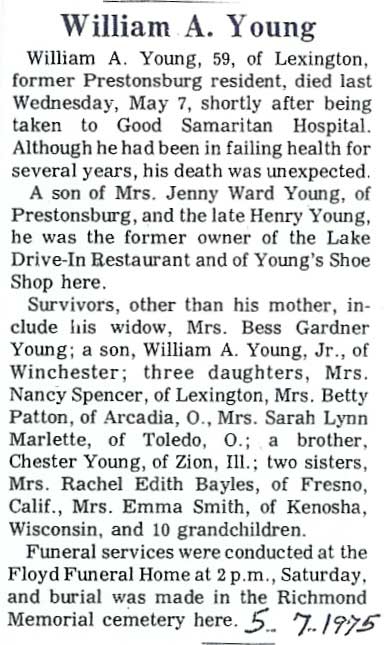 Age 52, of Varney, died Feb. 6, 1999. Born Jan. 3, 1947, in Pike Co. s/o the late A.C. Young and Bertha Mae Robinette Young. Survivors include wife, Ruby Smith Young; one son, Venice Glen Young; two dau. Linda Hunt and Bertha Horn; seven brother, James W., Jessie Roger, Tracy, Denzil, Ben, and Nelson Young; four sisters, Toy Mae Varney, Nina Lois Blackburn, Mavis Wallace and Verlie Gail Harrison. Burial was in the Young Family Cemetery at Varney. YOUNG, William A. Obit Submitted by From the scrapbook of Cora Coburn Meadows (FCT'S)